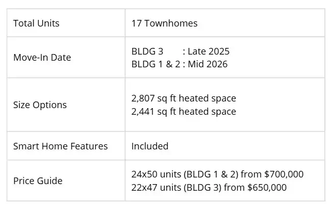 Building 3 comprises 6 townhomes, each with approximately 2,441 sq ft of heated space.These homes include a 2-car garage, 3 bedrooms, a master bedroom with a built-in closet system, and 3½ bathrooms. These units are ideal for small families.